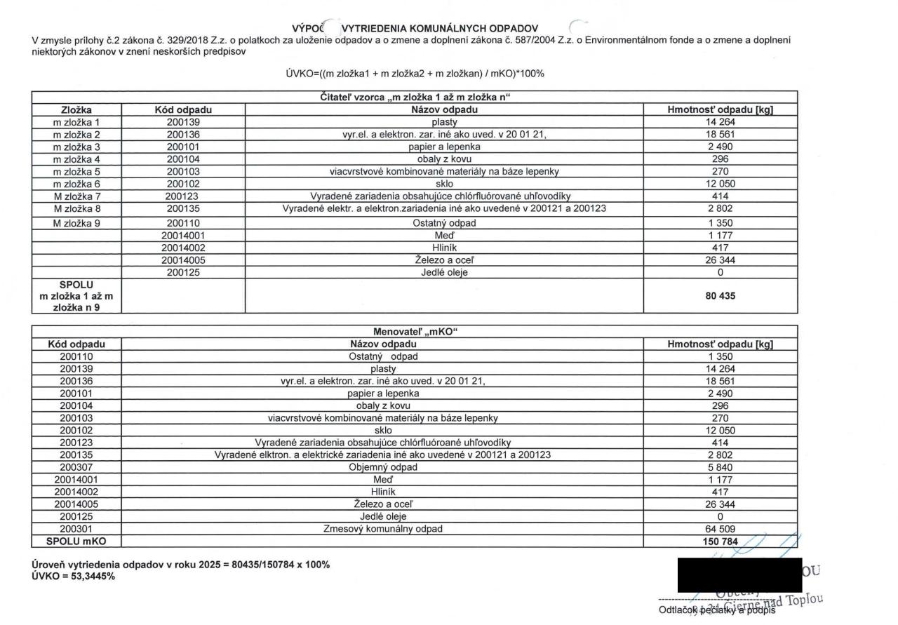 Výpočet vytriedenia komunálnych odpadov za rok 2025