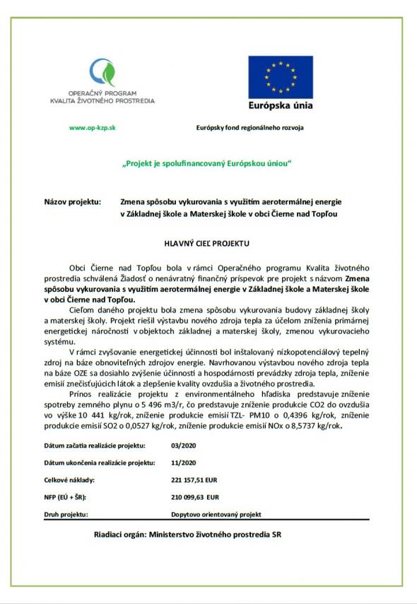 Zmena spôsobu vykurovania s využitím aerotermálnej energie v Základnej škole a Materskej škole v Obci Čierne nad Topľou - informácia po ukončení